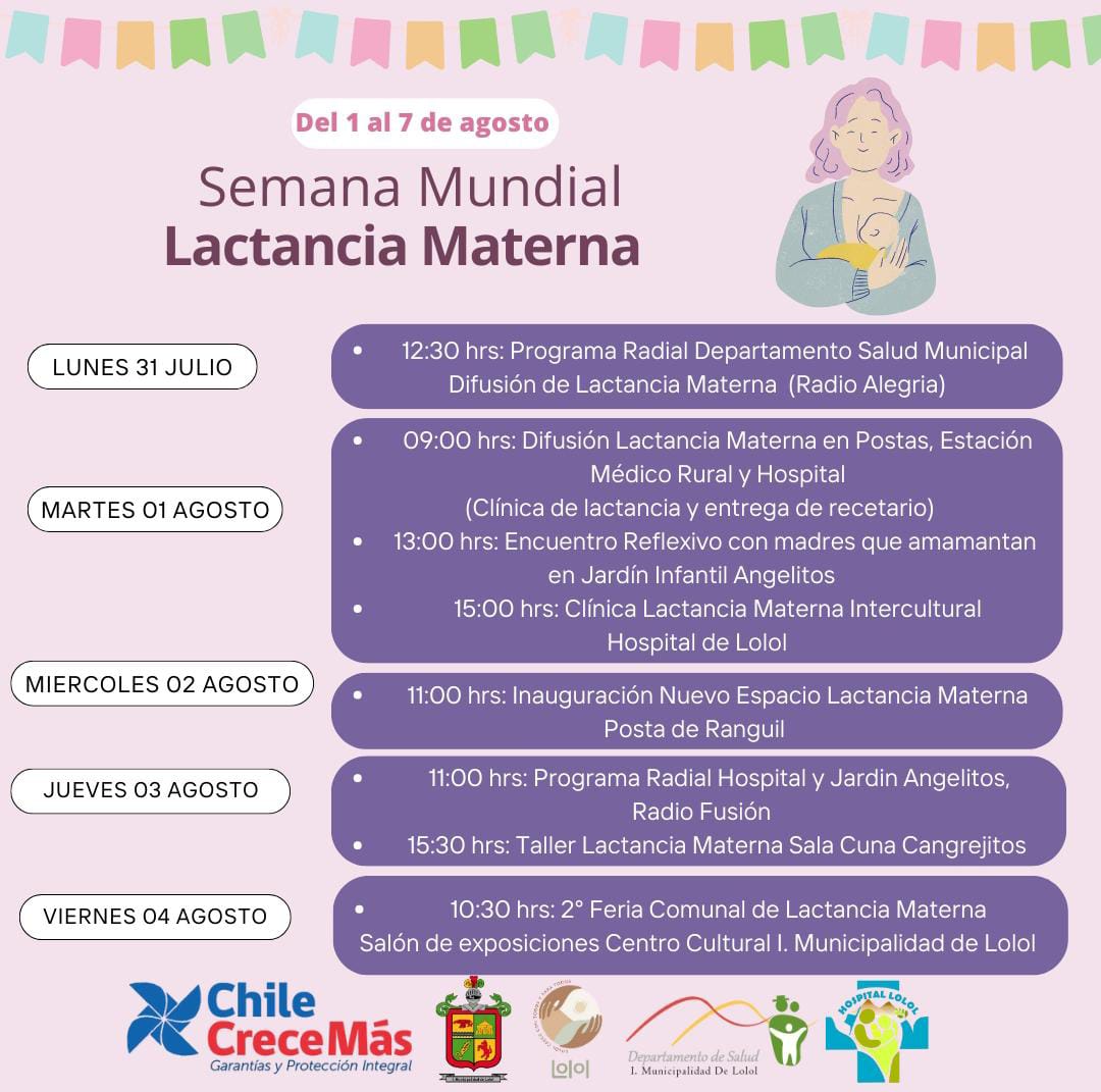 Las actividades comienzan el día lunes 31 de julio con la emisión de un programa del Departamento de Salud Municipal en Radio Alegría que entregará información de utilidad sobre la lactancia materna, continúan el martes 1 de agosto con la difusión de la lactancia materna en postas, estación médico rural y en propio hospital, luego a las 13 horas se realizará un encuentro reflexivo con madres que amamantan en jardín infantil Angelitos y a las 15 hrs. se desarrolla clínica de lactancia materna intercultural en el centro asistencial. El miércoles 2 de agosto a las 11 horas se inaugurará un nuevo espacio de lactancia materna en la posta de Ranguil, el jueves 3 de agosto asistirán a programa radial Sintonízate con el Hospital de Lolol de Radio Fusión y a las 15:30 horas se llevará a cabo taller de lactancia materna en Sala Cuna Cangrejitos y finalmente el viernes 4 de agosto a las 10:30 hrs se realizará la segunda feria comunal de lactancia materna en Salón de Exposiciones del Centro Cultural de la Ilustre Municipalidad de Lolol.
